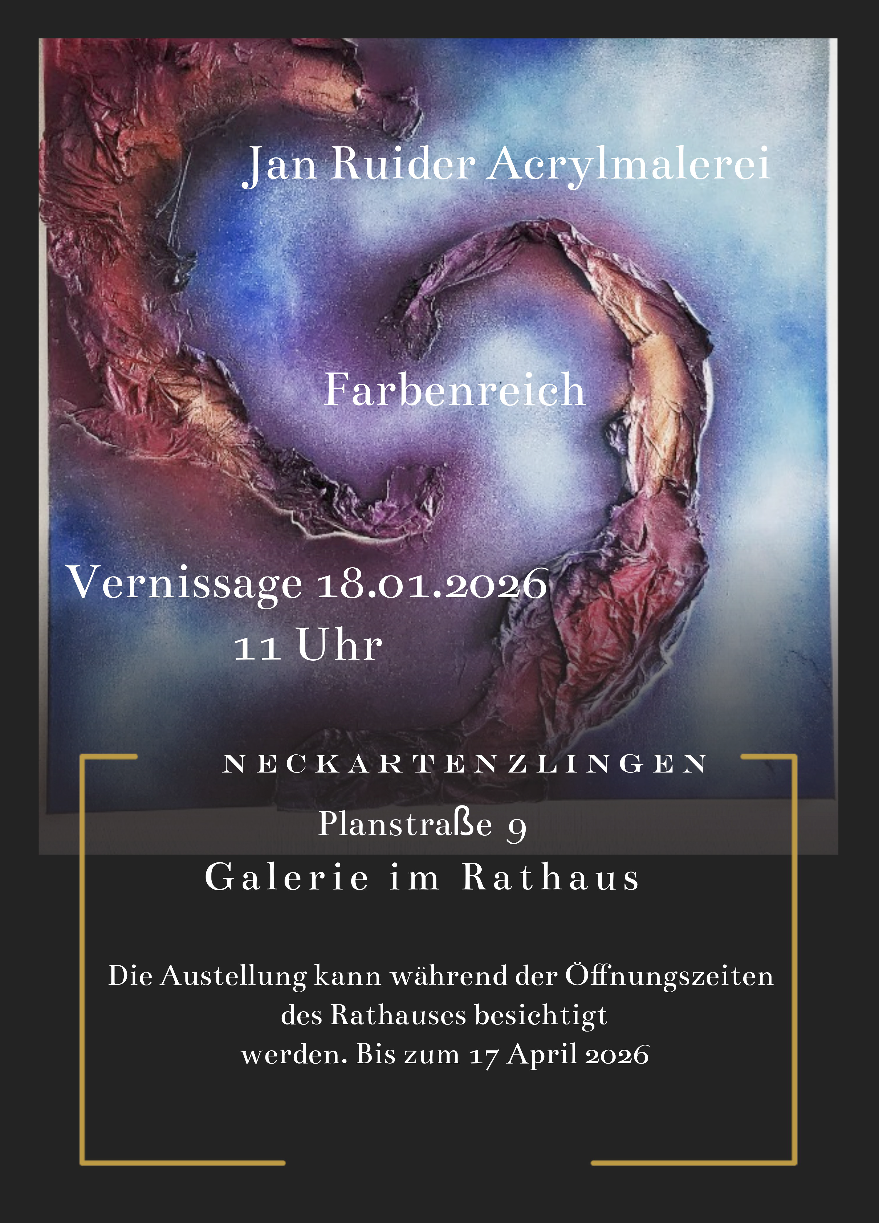 Ausstellungsbeginn am 19. Januar 2026 Jan Ruider Acrylmalerei > Plakat > Pressetext Ausstellungseröffnung > Foto |